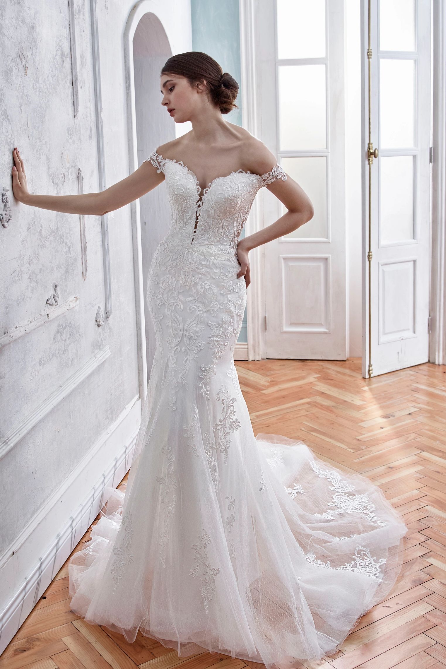 Tulle fit & flare dress with plunging V neckline and off-shoulder. Illusion back bodice with lace placement on sides. Sequined lace appliques applied on bodice and trailed down to hem. Shiny cobweb mesh under lace overlay creates misty effect to dress look. Fabric-covered buttons over zipper back closure.