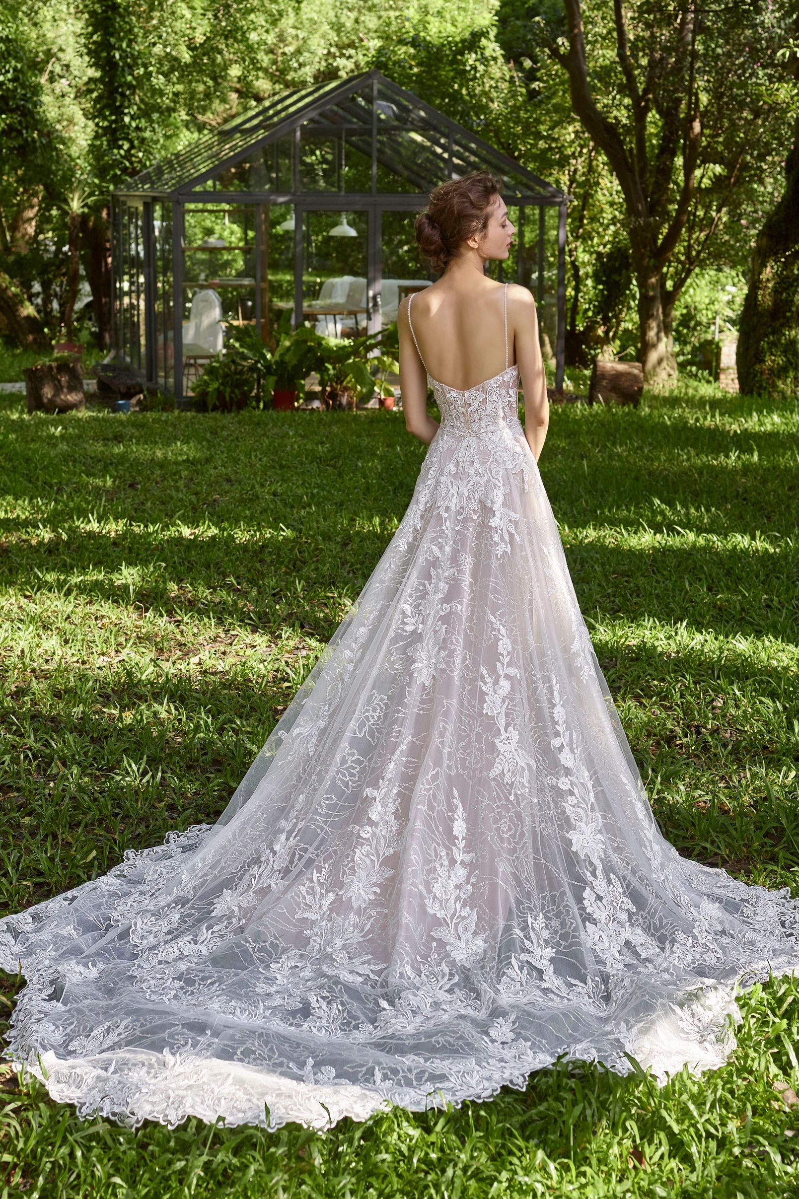 Gorgeous A-line dress with Plunging V-neck. Illusion bodice with lace placement & exposed bonings. The hand-made beaded line along with neckline and spaghetti straps. Rose glitter tulle under lace overlay creates a sparkling effect. Petal shape skirt hem.