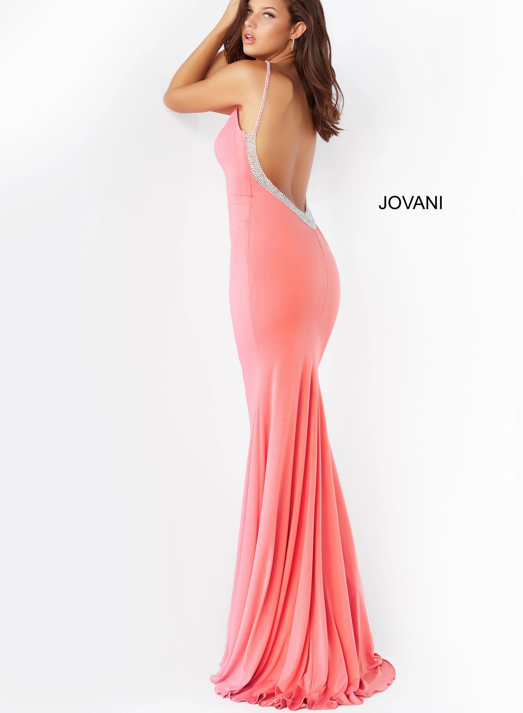 Long party dress features a form-fitting silhouette with a V-neckline, jazzed up with crystal trims on the spaghetti straps and open back. This simple jersey prom gown exits with a sweep train.